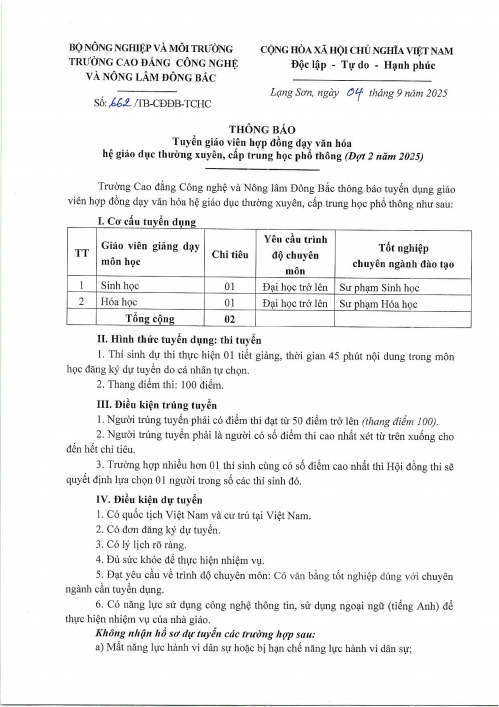 Thông báo tuyển dụng giáo viên hợp đồng dạy văn hóa hệ giáo dục thường xuyên, cấp trung học phổ thông năm 2025